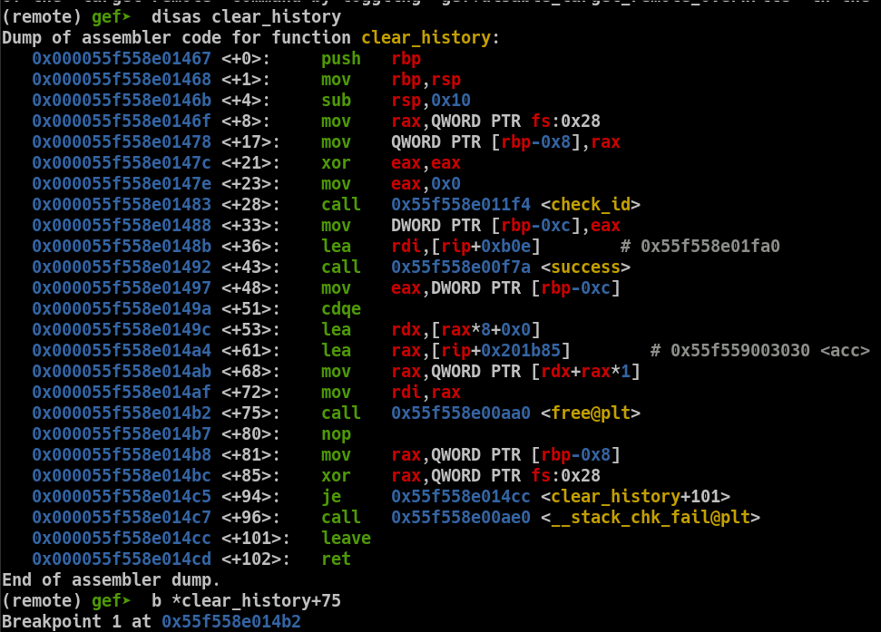 The clear_history() function is straightforward: it frees the chunk stored in acc[0]. However, it does not reset the freed pointer to NULL, which can lead to use-after-free situations.