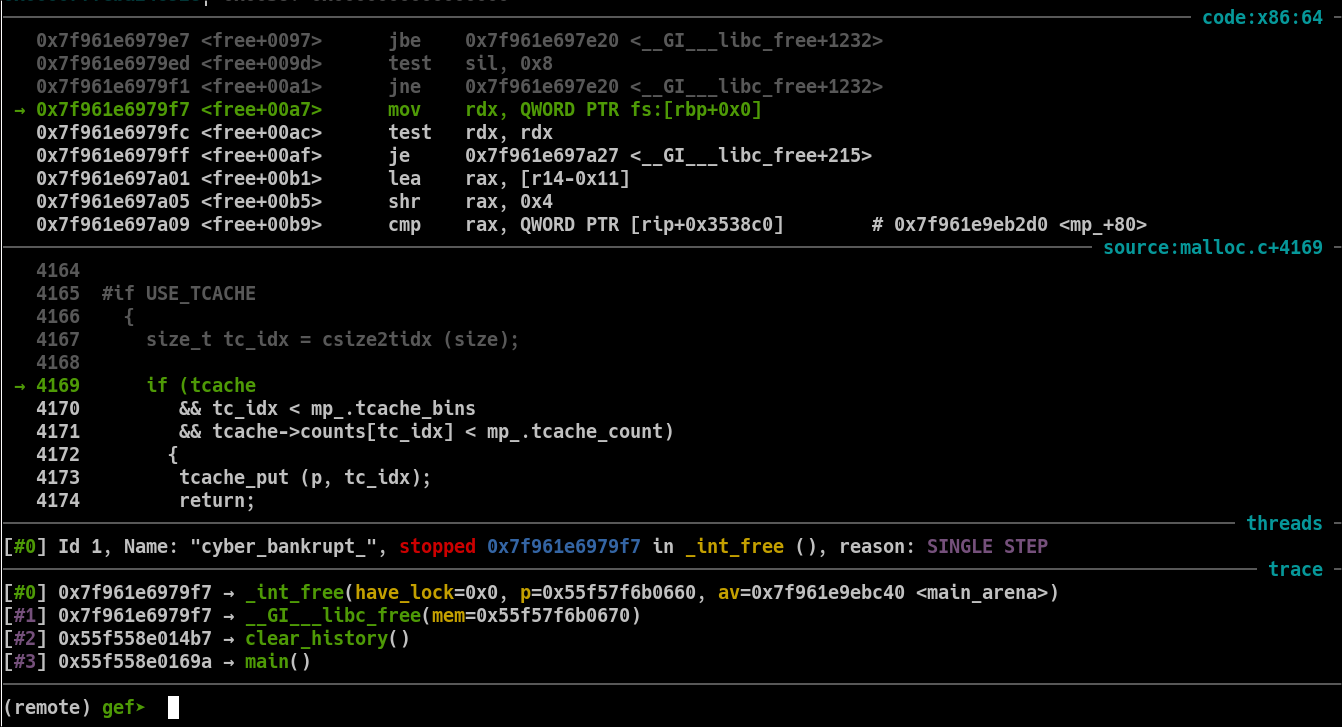 Cyber Bankrupt is a heap exploitation challenge with a very clear vulnerability allowing a use-after-double-free. However, the difficulty of the challenge comes from the constraints of the exploitation, making the libc leak particularly difficult. This writeup is not really about the challenge itself, but rather about the trick used to obtain a libc leak, which took a long time to figure out and for which I could not find any documentation more precise than the general concept of tcache poisoning.