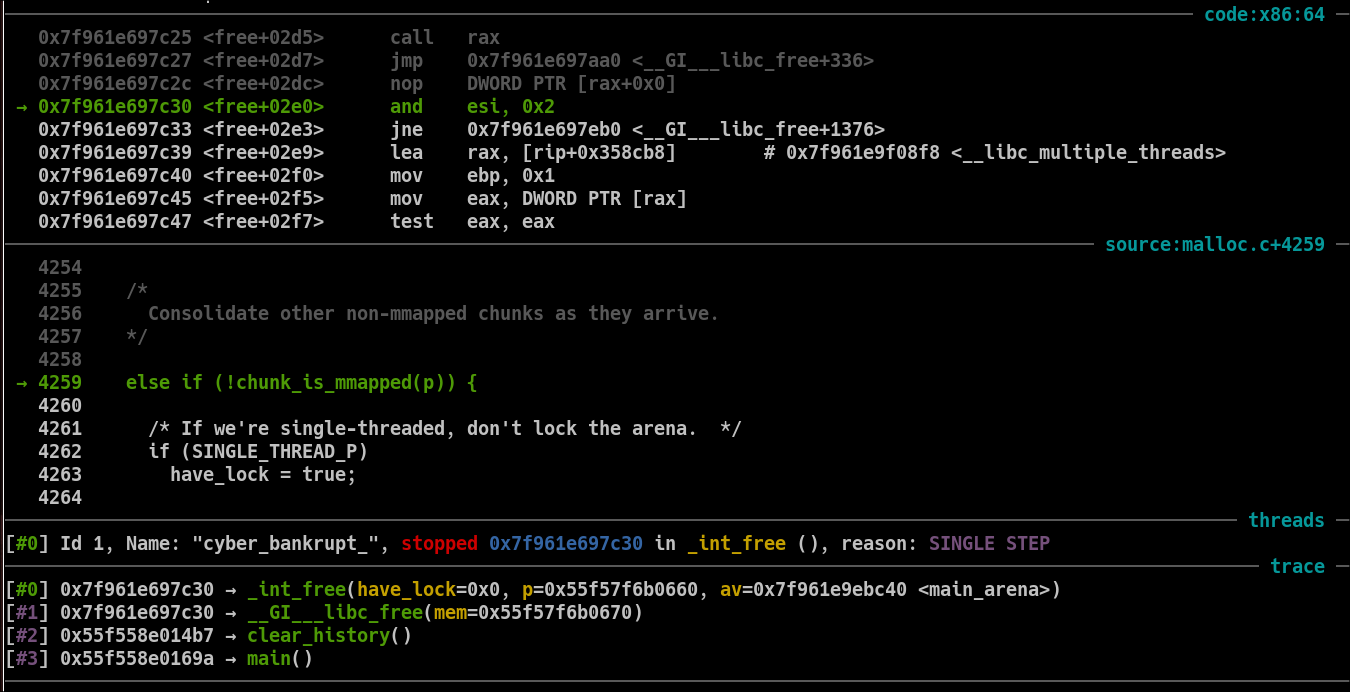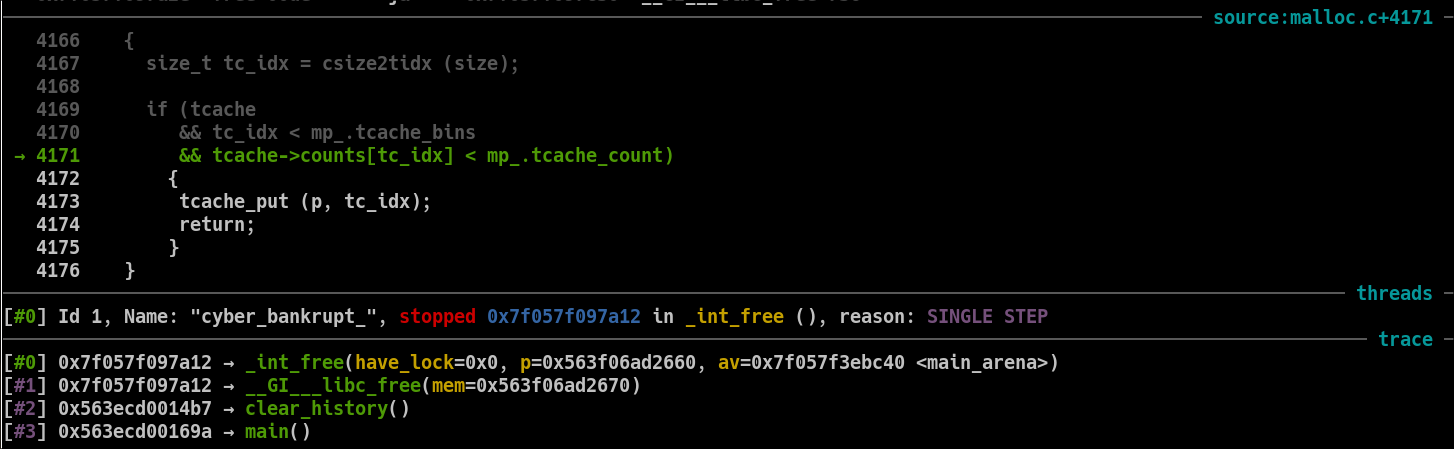 The last important note is that the libc version is 2.27. This is the version that introduced the per-thread cache mechanism. Since it was its first release, the security checks around it were weak and it easily allowed poisoning and double frees.