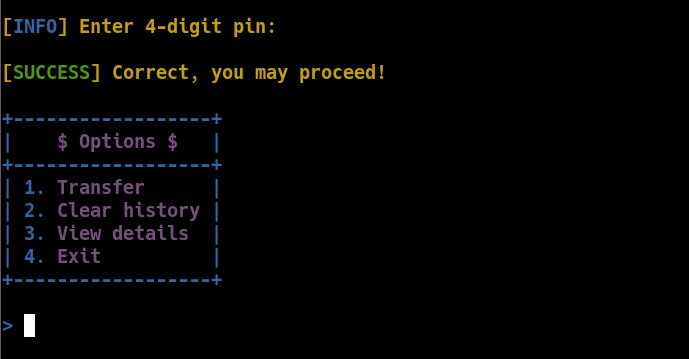 This is a menu-driven program with three functionalities: making money transfers, viewing transfer history, and deleting the history. These are essentially three heap primitives: the first calls malloc(), the second reads from a chunk, and the last frees it.