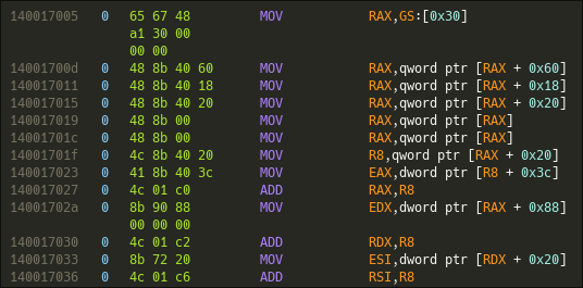 GS[0x30]in 64-bit is a global pointer to the TEB (Thread Environment Block) which contains all the information about the current thread.RAX + 0x60gets the PPEB (Process Environment Block) which contains all the information about the current process.RAX + 0x18gets thePPEB_LDR_DATA(The loader data). which contains all the information populated by the loader. All information about the loaded modules is in there.RAX + 0x20gets the fieldInMemoryOrderModuleList, a doubly linked list that points to all modules by load order. This list is stored in a bigger struct calledLDR_DATA_TABLE_ENTRYwhich contains the information about the current module in the list.RAX, qword ptr [RAX]this instruction essentially reads the first field of the linked-list node (theFlinkfield). So this yields the next module in the linked list.RAX, qword ptr [RAX]same instruction, So after this the registerRAXholds the pointer to the third library loaded in memory.RAX + 0x20This one took me a while to understand. At this pointRAXis treated as aLDR_DATA_TABLE_ENTRYstruct. The fieldInMemoryOrderLinksis at offset0x10of this struct; adding0x20points to the offset0x30of theLDR_DATA_TABLE_ENTRY, which is theDllBasefield.