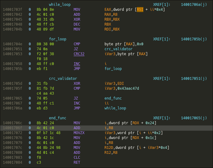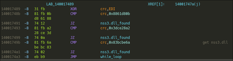 Without going into too much detail, the next step of the function iterates over all the function names in the third DLL (as described above), hashes each name character-by-character, and checks whether the result matches a hardcoded CRC32 value in the malware.
