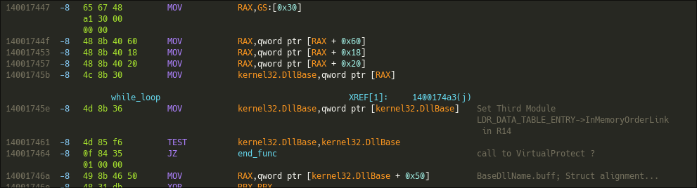 This method of locating libraries and functions is called PEB walking: we walk through the PEB and related loader structures to retrieve the information the malware needs.
