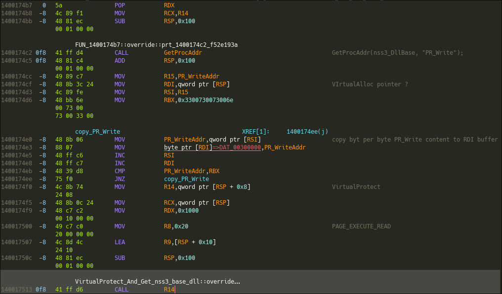 ql.mem.map(PR_WRITE_ADDRESS, len(PR_WRITE_BUFFER), UC_PROT_ALL, info="Emulates the pointer returned by GetProcAddr(nss3_DllBase, 'PR_Write');")
