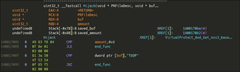 The hook first checks if the buffer is bigger than 4 and if it starts by POST, I guess this is a way to only hook POST requests and steal usernames, password, cookies, and such... It then uses the first function we analyzed to retrieve the GetProcAddress function.