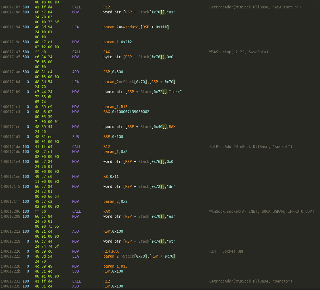 This gives the string : WSAStartup, which is a function of the winsock.h library. This function allocates a struct to further handle windows sockets.