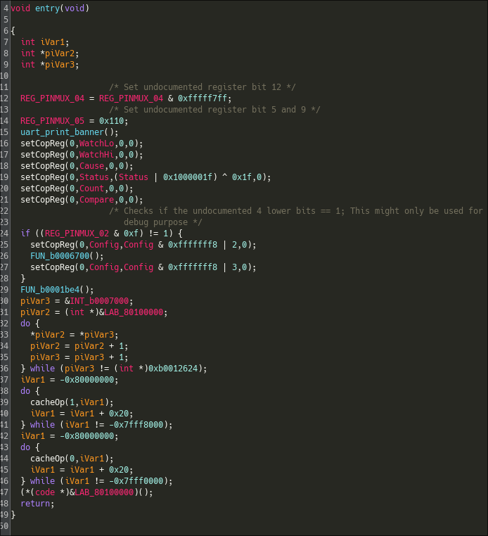 Since we don't how the bootloader launches the kernel, we decided to throw it into Ghidra. We started by identifying the entry() function located at 0x0c in the SPI flash and 0xb000000c in the SoC. It first configures the lower bits of a set of proprietary pin registers (REG_PINMUX_04, REG_PINMUX_05), then writes to undocumented UART registers in the rt_uart_1 memory region to print the first boot string: Booting....