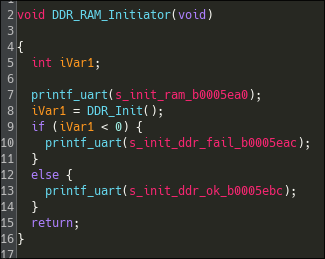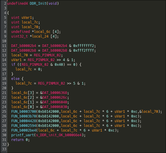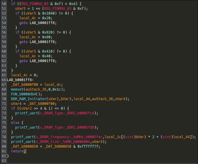 After some coprocessor configuration, the bootloader initializes the DRAM. Unfortunately, much of the code interacts with proprietary, undocumented memory regions that are neither described in the datasheet nor accessible from the UART shell. Attempts to read those regions via the UART just return zeros, which suggests they may be protected or bank-switched.